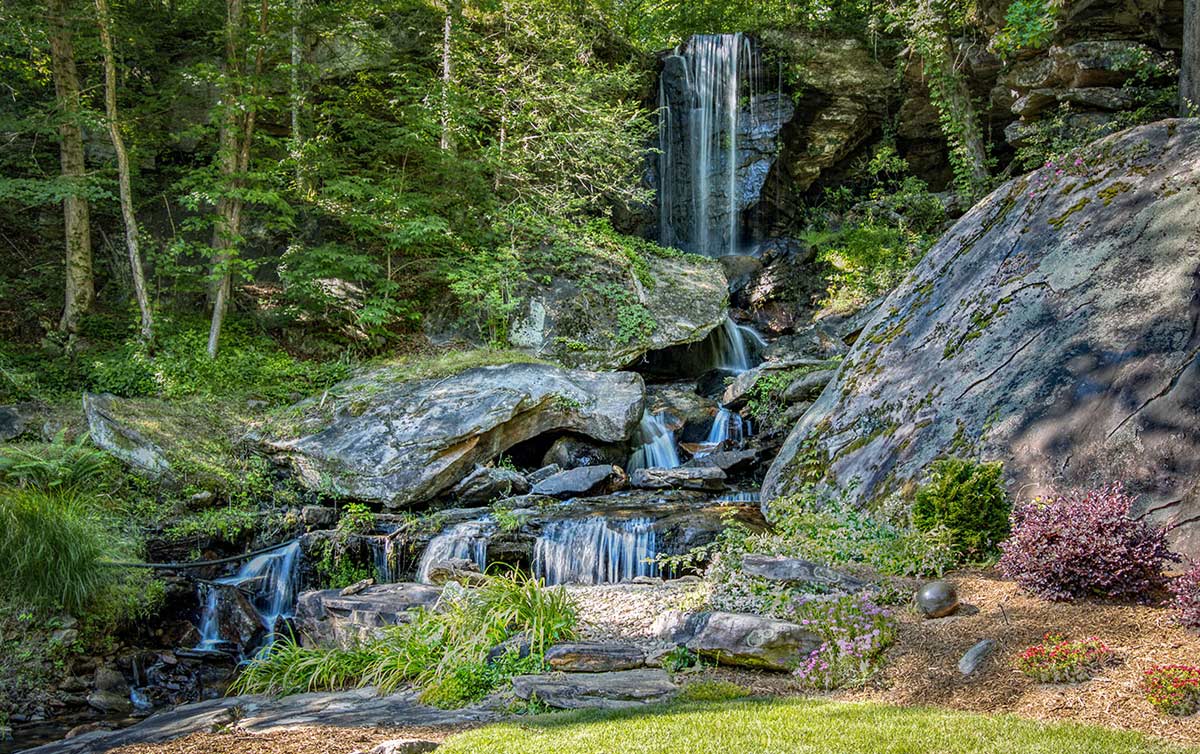 (SUNSET, S.C.) — NEWS: In the mountains of western South Carolina, on a private property in the picturesque, lake-dotted town of Sunset, you’ll find a most unusual lawn ornament. It rises 60-feet toward the sky, which, for the measurement-impaired, is about five stories, according to auction firm Tranzon Fox. This towering ornament is a natural waterfall, resplendent as the breathtaking focal point of owner Roger Abercrombie’s 5.8-acre property that might be more rightly termed a mountain oasis.