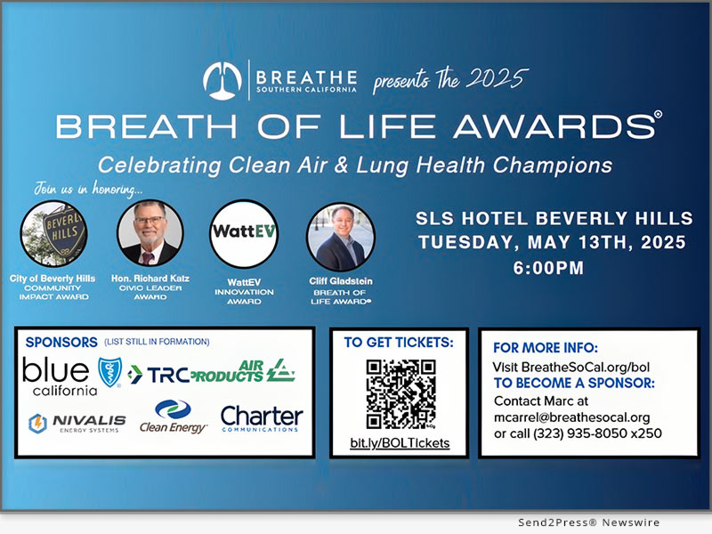 (LOS ANGELES, Calif.) — NEWS: On Monday, May 13, 2025, at 6 p.m., Breathe Southern California will host its highly anticipated Breath of Life Awards at the SLS Hotel in Beverly Hills. The annual event recognizes visionary leaders and organizations committed to advancing clean air, environmental health, and lung health equity across California.