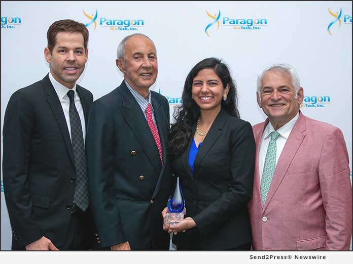 *Photo caption: Mohima Sanyal, 2019 recipient of the Koch Kellan scholarship, center, and (from the left) Patrick Witham, CEO and president of Paragon BioTeck, Doctor Robert E. Kellan, a board-certified ophthalmologist specializing in cataract and lens implant surgery, and Doctor Paul S. Koch, co-founder and medical director of Koch Eye Associates, officially presents Mohima with her scholarship. This scholarship is but a piece of the recognition Paragon Gives, a Paragon BioTeck, Inc. initiative, does to support the future of ophthalmology.