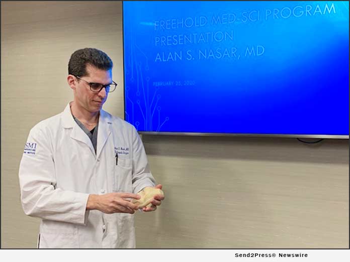 (FREEHOLD, N.J.) — NEWS: Dr. Alan Nasar, a board-certified orthopedic surgeon at Advanced Orthopedics and Sports Medicine Institute (AOSMI), Freehold and Monroe townships, N.J., recently presented an interactive video program to senior students enrolled in the Medical Science Program at Freehold Borough High School. Dr. Nasar tied together the use of innovation and technology with how both are being used to improve orthopedic surgery and the lives of patients.