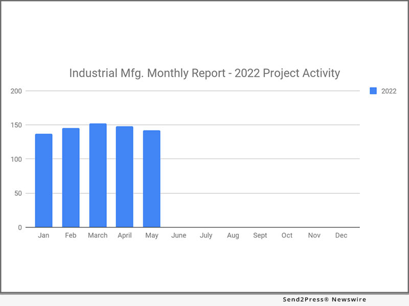 (JACKSON BEACH, Fla.) — NEWS: SalesLeads announced today the May 2022 results for the new planned capital project spending report for the Industrial Manufacturing industry. The Firm tracks North American planned industrial capital project activity; including facility expansions, new plant construction and significant equipment modernization projects. Research confirms 142 new projects in May and 148 in April in the Industrial Manufacturing sector as seen in the enclosed chart.