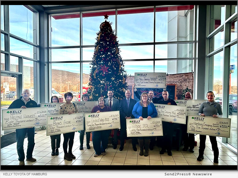(HAMBURG, Pa.) — NEWS: In the spirt of holiday giving, Kelly Toyota has seized the opportunity by providing contributions to three much-needed community causes in December 2023. As their motto goes, “For Over 90 Years, You Can Count on Kelly,” multiple local community services are the focus of Kelly’s generosity: New Journey Community Outreach, United Way of Berks County, Safe Berks, Berks Encore, Helping Harvest, Hillside SPCA, Tilden Township, Hamburg Emergency Medical Service, and more.