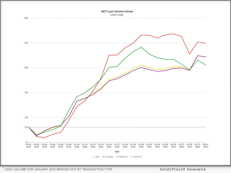 (SAN DIEGO, Calif.) — NEWS: Mortgage Capital Trading, Inc. (MCT®), the leader in capital markets software and services supporting more lenders with hedging and pipeline management solutions than any other single provider, is pleased to present the MCTlive! Lock Volume Indices for January 2023. MCT Data represents a balanced cross section of several hundred lenders among retail, correspondent, wholesale, and consumer direct channels. A broad-based view of the entire market provides a more accurate picture of mortgage originations versus indices that are influenced by mega lenders. The January MCTlive! Lock Volume Indices is broken out by transaction type: purchase, rate/term refinance, and cash out refinance.