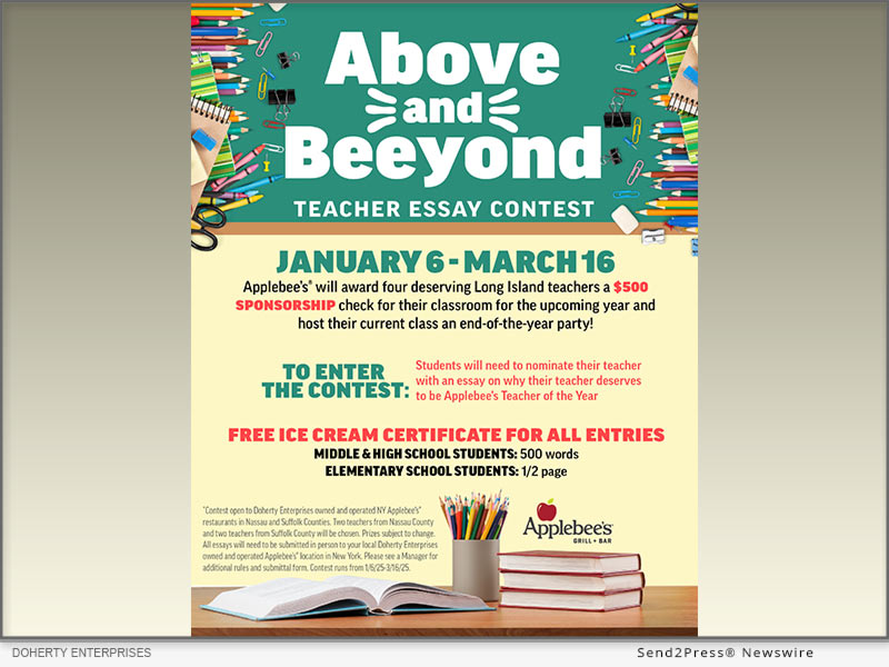 (LONG ISLAND, N.Y.) — NEWS: Doherty Enterprises-owned Applebee’s® Neighborhood Grill & Bar restaurants on Long Island announced today the official launch of their 9th annual Above and “BEE”yond Teacher Essay Contest. The annual essay contest celebrates outstanding teachers, nominated by their students, by awarding each a $500 sponsorship check and hosting a special end-of-year class party.