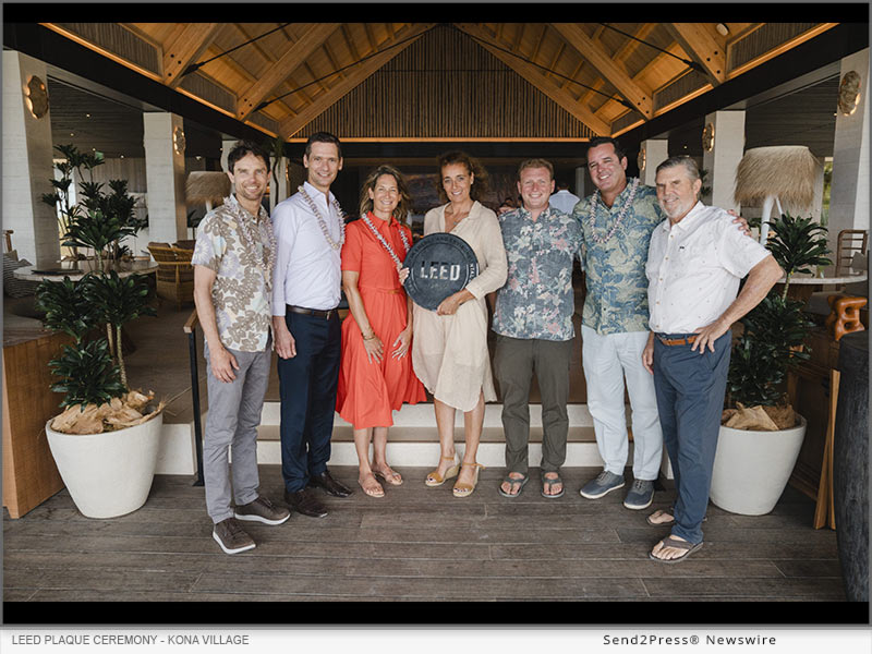 Photo Caption: Developer, owner, sustainability consultant and CEO of the USGBC attended a LEED plaque ceremony to dedicate the first of three LEED certifications for Kona Village’s three distinct sections. From left to right: Alex Spilger: Head of Global ESG – Kennedy Wilson; Peter Templeton: President and CEO – U.S. Green Building Council; Robyn Vettraino: Principal – Verde, A VCA Company; Sandra Estornell: Managing Director – Kona Village, a Rosewood Resort; Matt Comisar: Development Manager – Kennedy Wilson; Mike Eadie: Managing Director, U.S. Development and Construction – Kennedy Wilson; Scott Bedingfield: Project Director, Kona Village – Kennedy Wilson.